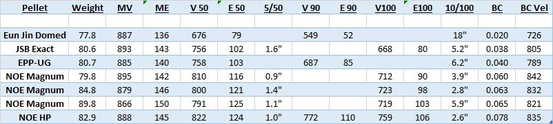 The Eun Jins were pretty dismal…. Not only did they have a low BC, but they sprayed the 100 yard target with an 18″ pattern at 100 yards…. The EPP-UG slugs were only a bit worse than the JSB Exact pellets of the same weight, and had a similar BC…. I have revised the BC on the NOE 83 gr. HP downwards slightly, based on the better data at long ranges…. However, it is still far better than any of the others….