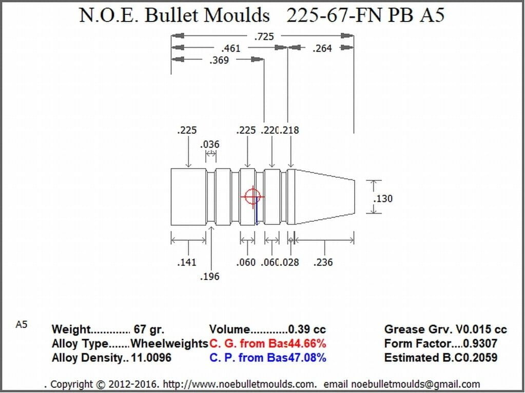 | The 225-67-FN-A5-41 is a 3 Cavity Aluminum mould. This mould drops a .225 caliber plain base 67 grain bullet with a Flat nose profile type. Designed for the 222 223 and 22-250. |