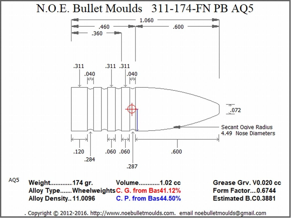 The 311-174-FN-AQ5-21 is a 2 Cavity Aluminum mould. This mould drops a .311 caliber Plain Base 174 grain bullet with a Flat nose profile type. Bullet designed by ELCO For target sports.