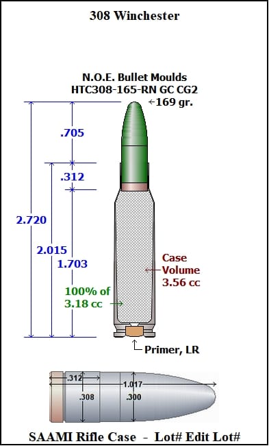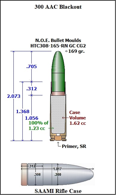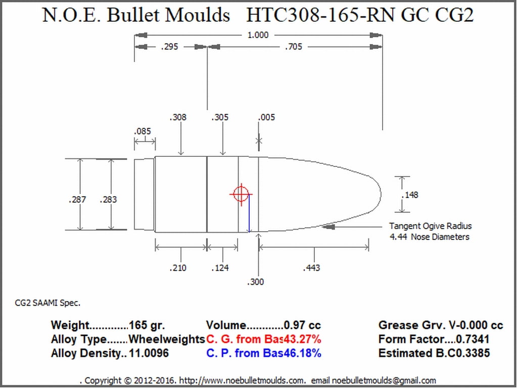 HTC308-165-RN-CG2 This mould drops a .308 caliber 165 grain bullet with a Round Nose profile type. Designed for a SAAMI Spec. 308 Win. Works great in just about all 30Cal. cartridges and is a real performer in a 300 AAC Blackout. Powder coated and with a GC it can be pushed to near jacketed velocities. Makes a great mid weight plinker and is a very good utility bullet.