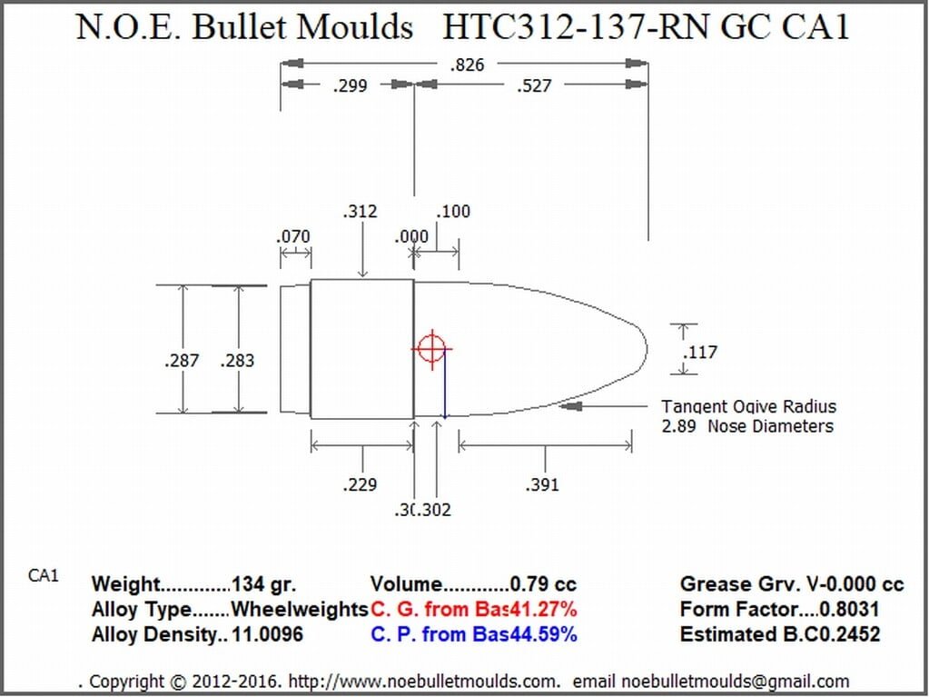 The HTC312-137-RN-CA1-70 is a 4 Cavity Brass mould. This mould drops a .312 caliber GasCheck and Plain Base 137 grain bullet with a Round Nose profile type. Designed for Powder coating or HTC Coating. NOE recommends HTC as the simplest and best way to get perfect coated bullets every time.