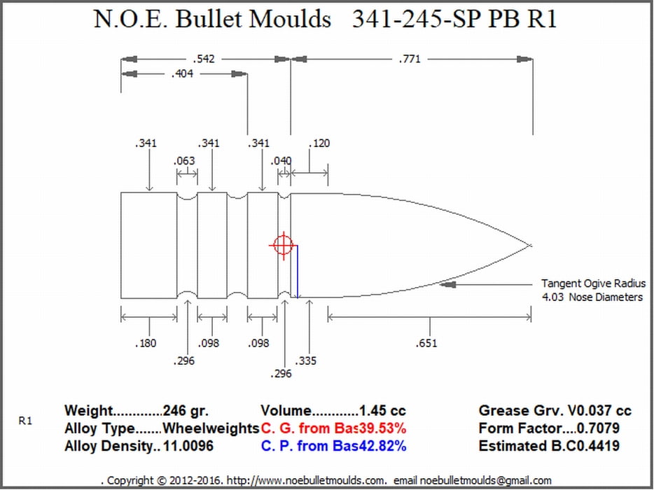 The 341-245-SP-R1-41 is a 3 Cavity Aluminum mould. This mould drops a .341 caliber Plain Base 245 grain bullet with a Spire point profile type. Bullet designed by Egan For target sports.