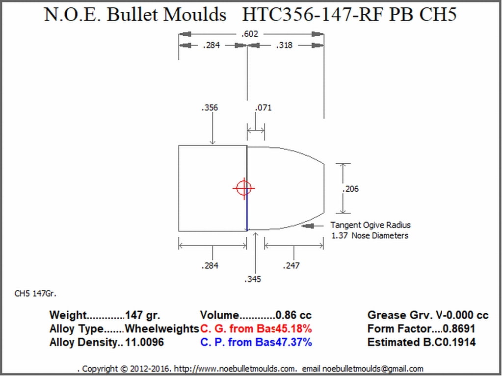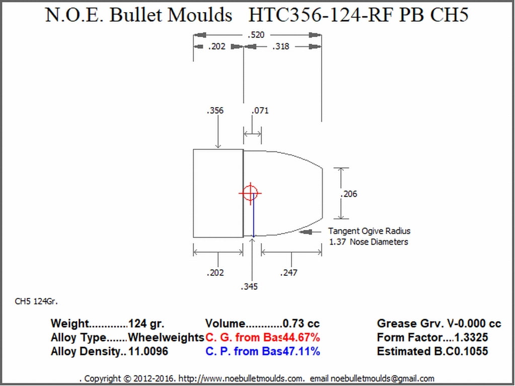 The HTC356-90-RF-CH5-322 is a 2 Cavity steel mould. This mould drops a .356 caliber 90 grain Hollow Base, 115 grain Plain Base, 125 grain Plan Base or 147 grain Plain Base bullet, the four weights are created by changing the base pins to form either the shorter 90 gr. or the longer 115, 125, or 147 gr cavity. This bullet is designed for HTC coating or powder coating.