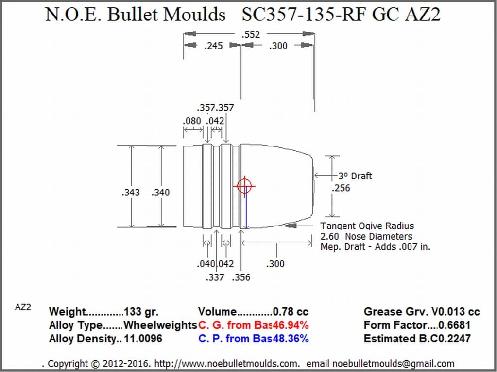 The SC357-135-RF-AZ2-19 is a 2 Cavity Aluminum mould. This mould drops a .357 caliber GasCheck and Plain Base 135 grain bullet with a Round/Flat nose profile type. These are the world renowned Ranch Dog Moulds. Made to his specifications and only avialable through NOE.