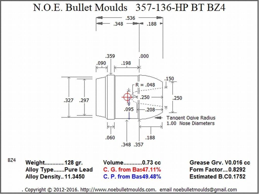 The 357-136-FN-BZ4-115 is a 4 Cavity Aluminum mould. This mould drops a .357 caliber Boat tail 136 grain bullet with a Flat nose profile type. Bullet design for use in air rifles. This is an RG4 Removable Guide Style Hollowpoint mould. This mould can be converted to flat point cup point or hollowpoint by changing pins.