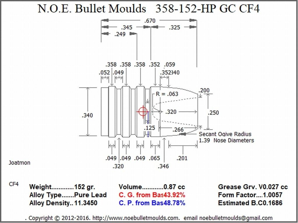 358-152-HP-CF4 RG2 cavity GC This is a 152gr hollow point bullet cast from pure lead for 35Cal Air rifles. This was designed by Bob Joatmon