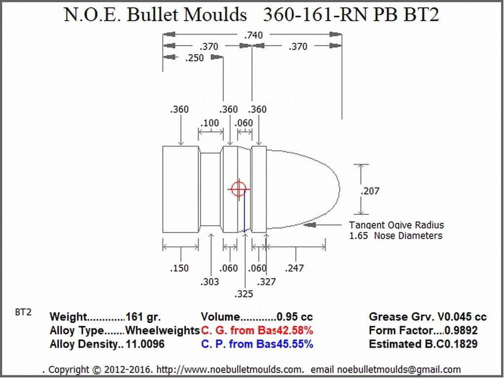 The 360-161-RN-BT2-42 is a 3 Cavity Aluminum mould. This mould drops a .360 caliber Plain Base 161 grain bullet with a Round Nose profile type. The Classic 360311 round nose design for 38 Special and 357.