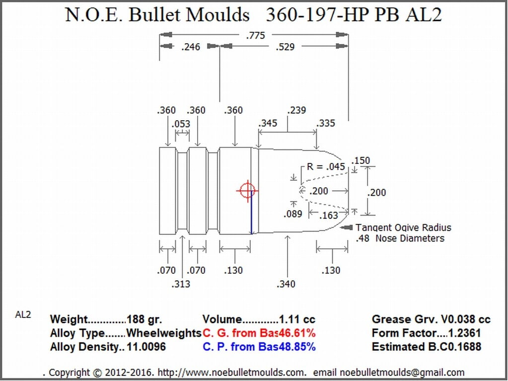 The 360-197-RN-AL2-107 is a 2 Cavity Brass mould. This mould drops a .360 caliber Plain Base 197 grain bullet with a Round Nose profile type. An improved RCBS style heavyweight round nose for use in the 357 Magnum. This is an RG2 Removable Guide Style Hollowpoint mould. This mould can be converted to flat point cup point or hollowpoint by changing pins.