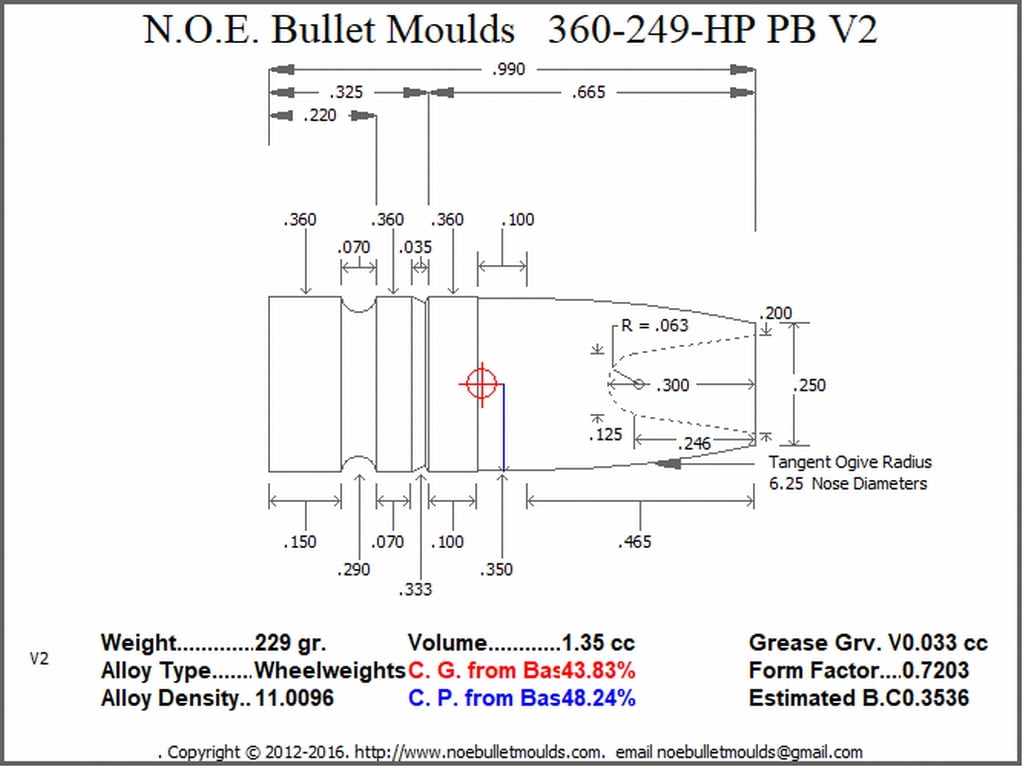 360-249-RN V2 This mould drops a .360 caliber 249 grain bullet with a Round Nose profile type. Made for the 35 REM and 35 Whelen.  Our version of the classic Lyman 360318. Makes a great hunting bullet with some real good stoping power..