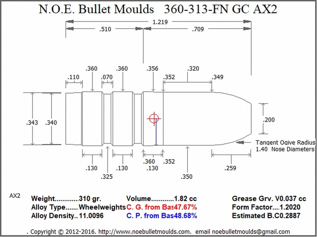 The 360-313-FN-AX2-31 is a 2 Cavity Brass mould. This mould drops a .360 caliber Gas Check 313 grain bullet with a flat nose profile type.