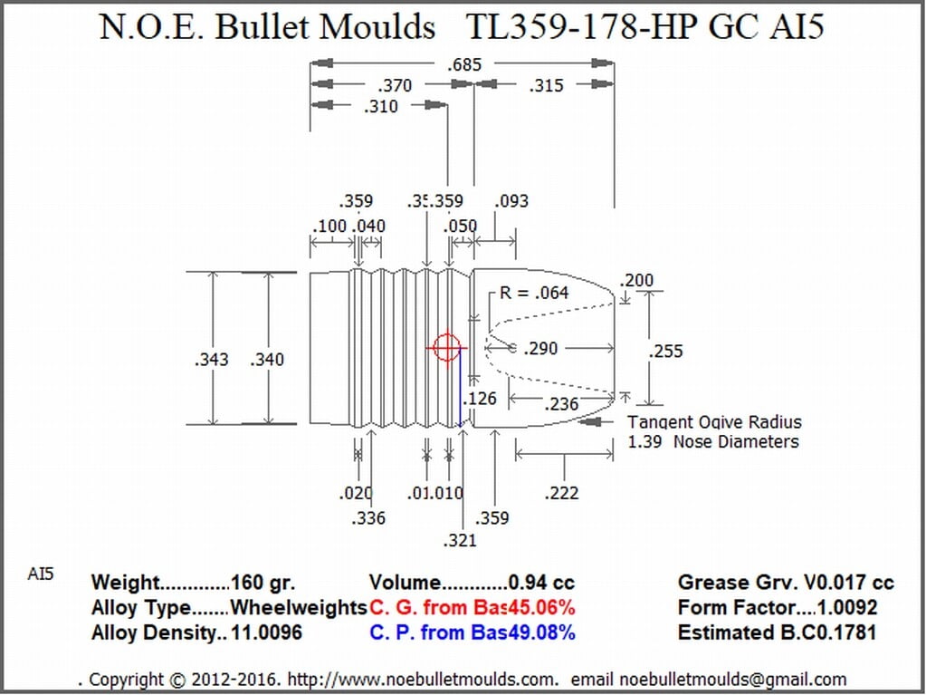 The TL359-178-RF-AI5-118 is a 4 Cavity Brass mould. This mould drops a .359 caliber Gas Check 178 grain bullet with a Round/Flat nose profile type. Tumble lube style bullet. NOE Recommends Xlox from White Label Lube for a no sizer needed lube. This is an RG4 Removable Guide Style Hollowpoint mould. This mould can be converted to flat point cup point or hollowpoint by changing pins.