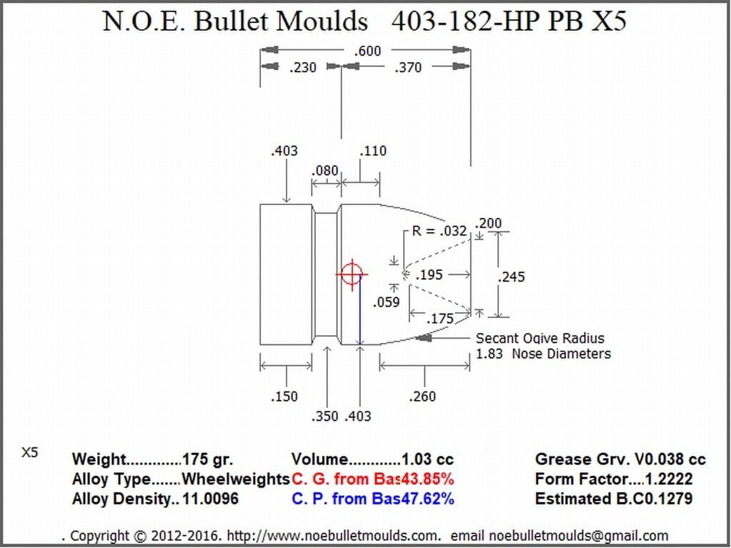 The 403-182-RF-X5-101 is a 2 Cavity Aluminum mould. This mould drops a .403 caliber Plain Base 182 grain bullet with a Round/Flat nose profile type. This mould casts a heavy Round Flat profile for 40S&W subsonics and 10mm full power loads. This is an RG2 Removable Guide Style Hollowpoint mould. This mould can be converted to flat point cup point or hollowpoint by changing pins.