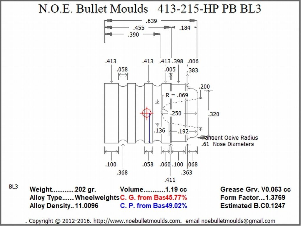 The 413-215-WC-BL3-107 is a 2 Cavity Brass mould. This mould drops a .413 caliber Plain Base 215 grain bullet with a Wadcutter profile type. A wadcutter desinged for use in 41 S&W Special and 41 Magnum. This is an RG2 Removable Guide Style Hollowpoint mould. This mould can be converted to flat point cup point or hollowpoint by changing pins.