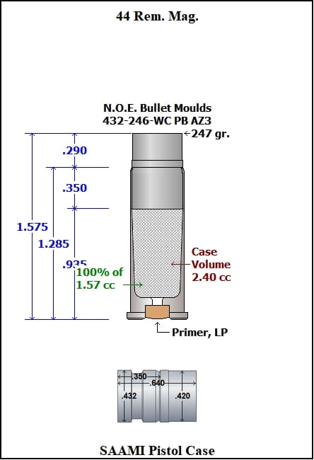432-246-WC AZ3 This mould drops a .432 caliber 246 grain bullet with a Wad-Cutter nose profile type. A great bullet for the 44 Spcl, or 44 Rem Mag. A great paper punch – and mid range dirt clod buster / plinker. . This mould can be converted to flat point cup point or hollowpoint by changing pins.