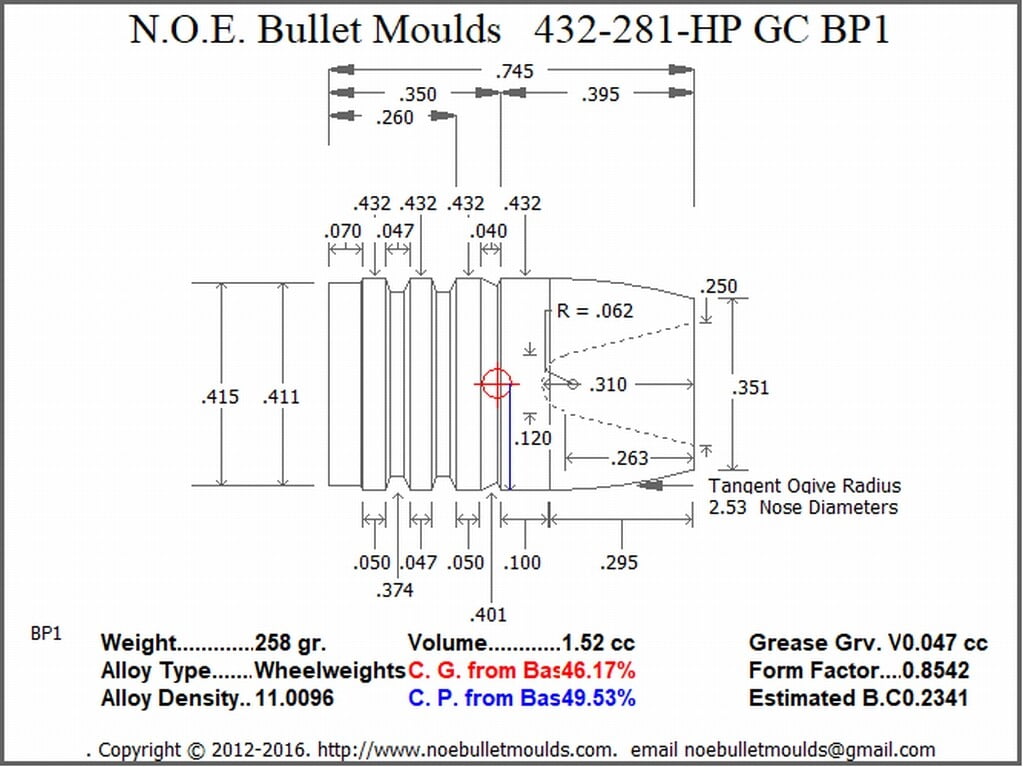 The 432-281-WFN-BP1-100 is a 2 Cavity Aluminum mould. This mould drops a .432 caliber Gas Check 281 grain bullet with a Wide Flat nose profile type. The Wide Flat Nose bullet for 44 Magnum hunting loads. also available as a hollowpoint. This is an RG2 Removable Guide Style Hollowpoint mould. This mould can be converted to flat point cup point or hollowpoint by changing pins.