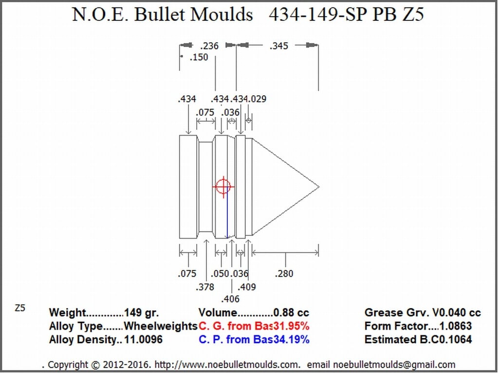 The 434-149-SP-Z5-21 is a 2 Cavity Aluminum mould. This mould drops a .434 caliber Plain Base 149 grain bullet with a Spire point profile type. A lightweight Carl F. Hudson design for plinking and target shooting with the 44 Special and 44 Magnum.
