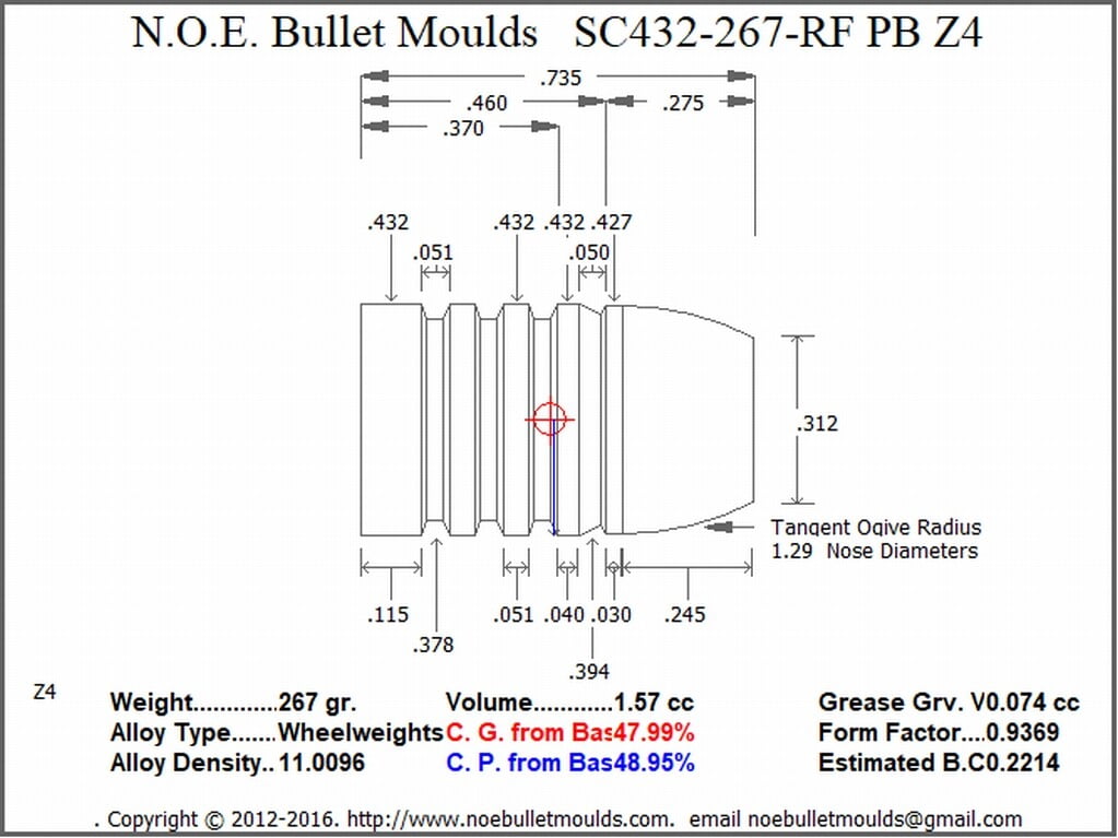 SC432-267-RF-Z4 This mould drops a .432 caliber 267 grain bullet with a Round, Flat nose profile type. These are the world-renowned Ranch Dog Moulds. Made to his specifications. We thank Ranch Dog for trusting us to produce his designs. Watch out for inferior copes, Only available through NOE.