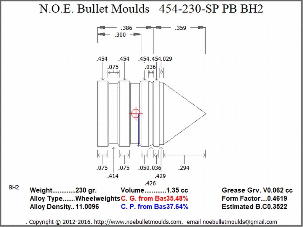 The 454-230-SP-BH2-61 is a 4 Cavity Aluminum mould. This mould drops a .454 caliber Plain Base 230 grain bullet with a Spire point profile type. A standard weight Himmelwright bullet for the 45 Colt.