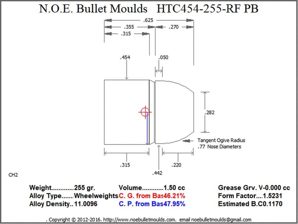 The HTC454-115-FN-CH2-33 is a 2 Cavity Brass mould. This mould drops a .454 caliber, 115 grain Hollow Base,  148 grain Plain Base or 255 grain  Plain Base bullet, the three weights are created by changing the base pins to form either the shorter 115gr. or the longer 255 gr cavity. This makes for a very versatile 3 bullet, bullet mould. These bullets are designed for Powder coating or HTC Coating. NOE recommends HTC as the simplest and best way to get perfect coated bullets every time.