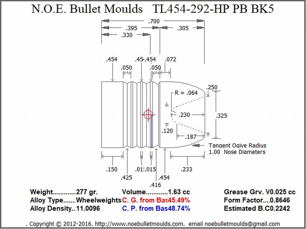 The TL454-292-RF-BK5-113 is a 4 Cavity Aluminum mould. This mould drops a .454 caliber Plain Base 292 grain bullet with a Round/Flat nose profile type. Tumble lube style bullet. NOE Recommends Xlox from White Label Lube for a no sizer needed lube. This is an RG4 Removable Guide Style Hollowpoint mould. This mould can be converted to flat point cup point or hollowpoint by changing pins.