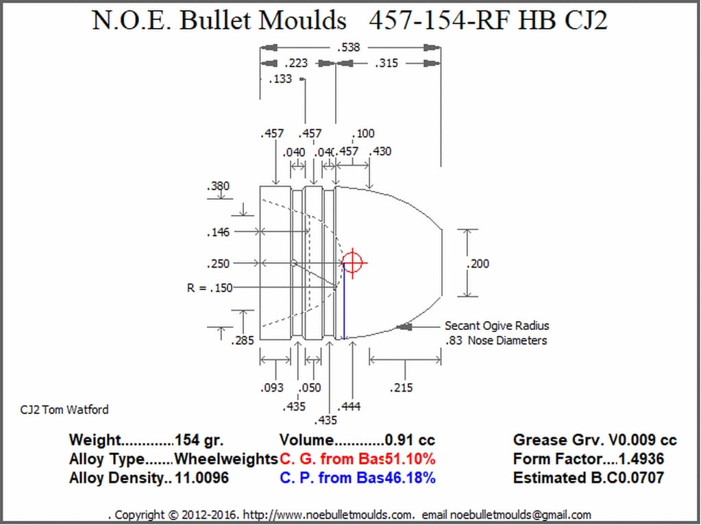 457-154-RF-CJ2-22 is a 4 Cavity aluminum mold dropping a .457 diameter 154gr round flat nose hollow based bullet.  This is a RG style mold for the base cavity.
