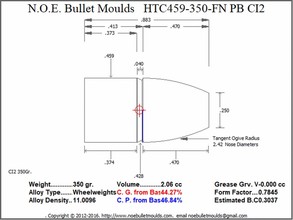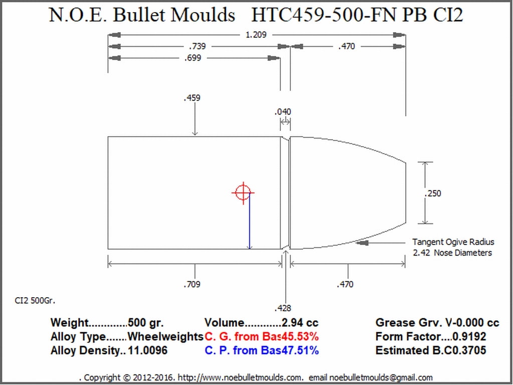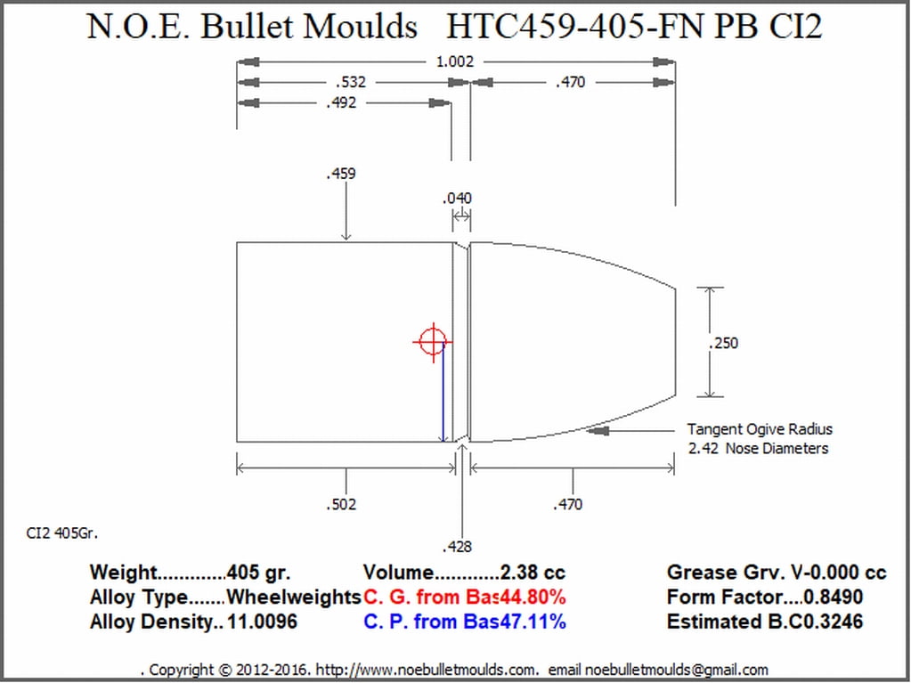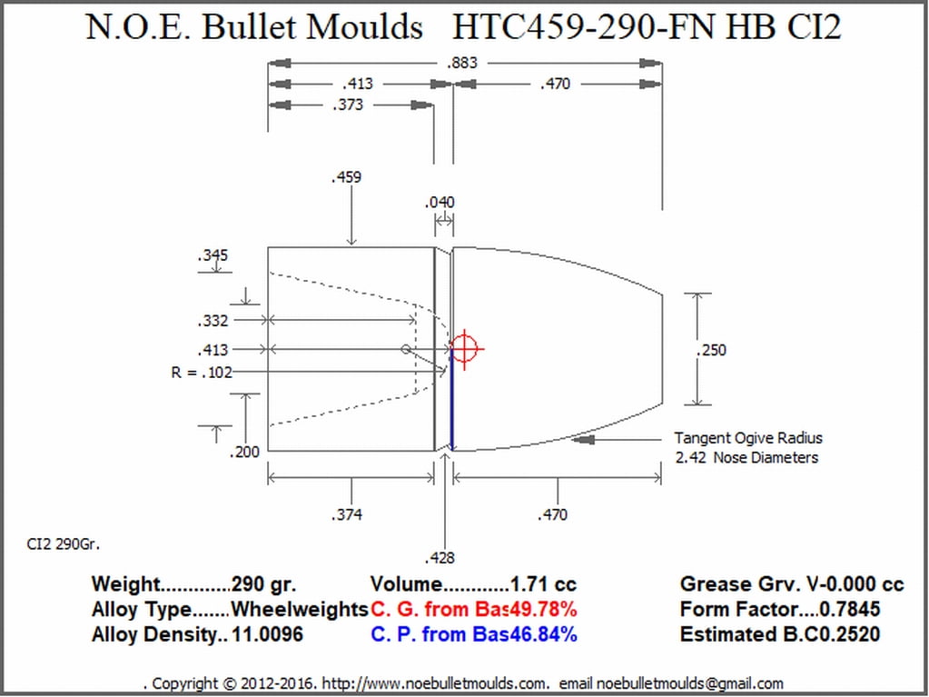 The HTC459-290-FN-CI2-62 is a 4 Cavity aluminum mould. This mould drops a .459 caliber, 290 grain Hollow Base bullet, 350 grain Plain Base, 405 grain Plan Base or 500 grain Plain Base bullet, the four weights are created by changing the base pins to form either the shorter 290 gr. or the longer 350, 405, or 500 gr cavity. This makes for a very versatile 4 bullet, bullet mould. This bullet is designed for Powder coating or HTC Coating. NOE recommends HTC as the simplest and best way to get perfect coated bullets every time.
