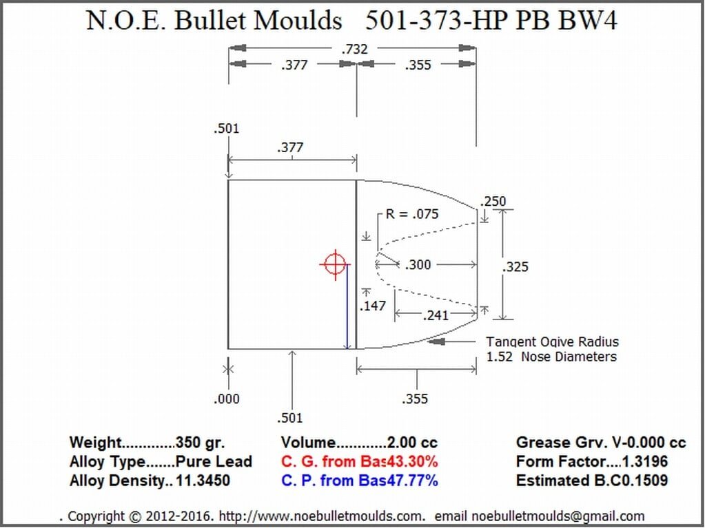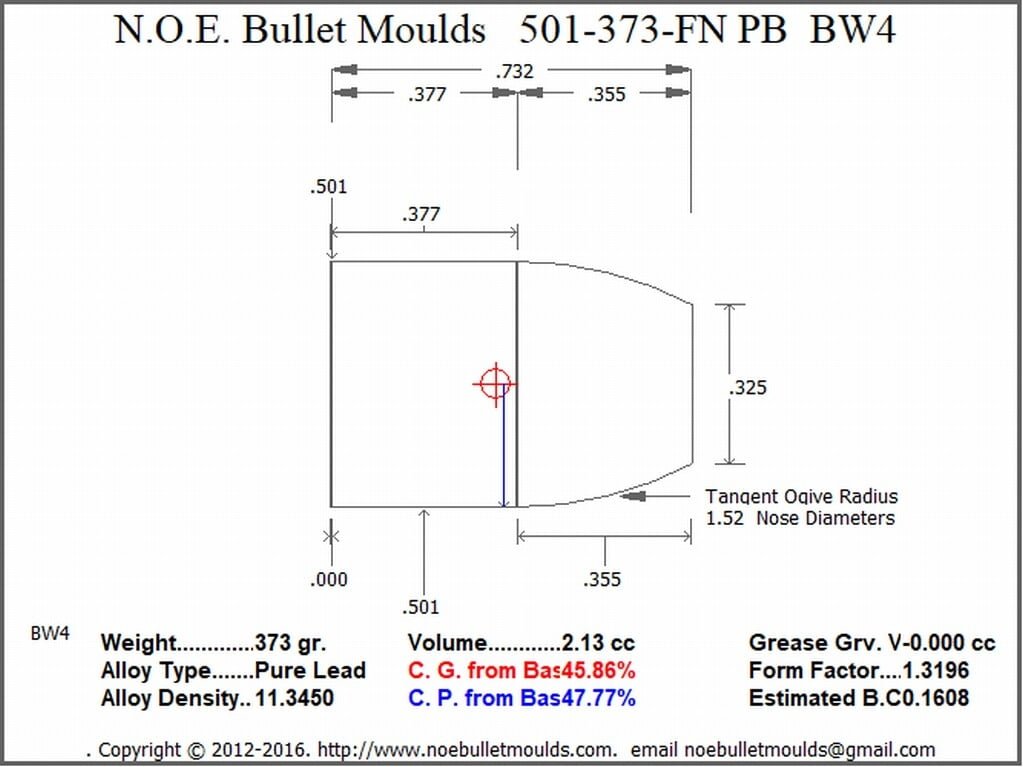 The 501-373-FN-BW4-101 is a 2 Cavity Aluminum mould. This mould drops a .501 caliber Plain Base 373 grain bullet with a Flat nose profile type. The heavy Round Flat Nose bullet designed to be powder coated. For use in 50 Action Express and 500 S&W This is an RG2 Removable Guide Style Hollowpoint mould. This mould can be converted to flat point cup point or hollowpoint by changing pins.